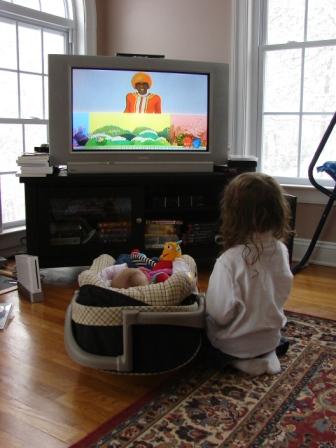 It was nice to have some quiet time for just me and Oona. I made a pumpkin cream pie and worked on my socks a bit (still didn’t finish…..I only get a few baby free minutes here and there). After they came in for good Neve earned her “McEnroe” nickname all over again, throwing fits whenever she lost at Wii tennis, and outright sobbing uncontrollably anytime she was beat at any other game. She could not be calmed, and would not relinquish the remote for anything. I swear, if ever there are moments you question the wisdom of having children, these are them. I had to turn the darn thing off. But it ended up alright. Neve and Oona sat together and watched what has become my sanity saver, Yo Gabba Gabba. Have you seen it? As many will testify, I absolutely hated Yo Gabba Gabba the first time I saw it. I wanted to know just what Nick Jr. was thinking airing such a crazy show. Admittedly, I was barely able to make it past the host’s wild getup before I changed the channel. But, the kids LOVE it, and the songs are catchy, and the next thing I know I am enjoying it as well. And Oona squeals now when I turn it on for her. She’ll sit nicely for about an episode a day, which is enough time for me to empty the dishwasher, load it back up and maybe have a cup of coffee (sometimes even breakfast!!) in the process. And it has become part of the vernacular of our home now, along with The Simpsons, Futurama, Dirty Jobs, and various other programs (we watch way too much tv).