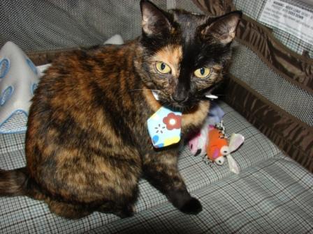 Milo in his tie. Milo would like to destroy me for humiliating him this way, but he is too hungry.