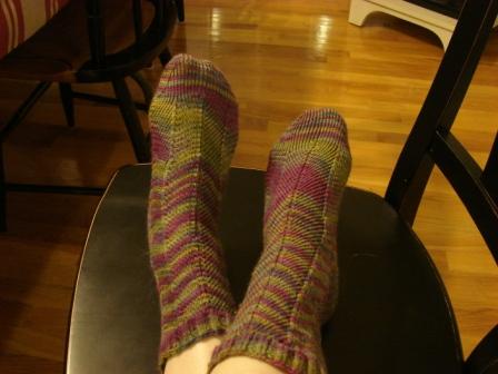 Sorry for the crappy pic. I also finished some wine with those lovelies, so I wasn’t too concerned at the time about how the picture looked. I am very happy with how they turned out – especially after I had to rip back the first sock several times due to problems with gauge and fit. The colors pooled a bit after I turned the heel, but I actually kind of like it like that. During my first go round there was no striping at all on the cuffs and it looked kind of neat. But I’ve grown to love the stripes and the socks are very warm and comfy. I used Lorna’s Laces Shepherd Sock yarn which I really enjoyed working with. Next up I’ll be trying out some Blue Moon Fiber Arts’ Socks That Rock yarn, and I am very excited! But, before I can cast on any of that I have about umpteen other projects to work on.