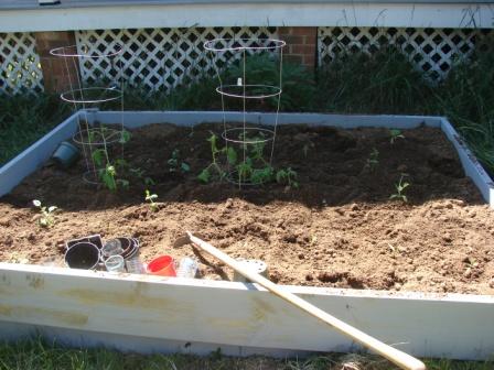 I had a bunch of vegetable plants waiting to go in, and while the machine was being worked on they started looking rather sad. They also suffered some Sushi – style damage. Bite marks, chewing, and the like. So when everything was ready for them to go in the ground I jumped to it. Unfortunately I wasn’t exactly prepared to do it. I ended up in the big ol’ box o’ dirt barefoot and using my hands to get the plants set and happy. It was evening and was somewhat chilly but the dirt was still warm from being in the sun all day. There was actually something really fulfilling on a primal level about being in the dirt like that and setting the veggies in place.