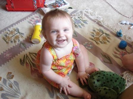 Which brings me to the current deadheading phase. The one I don’t like. Hint: it involves petunias and geraniums. Getting outside every day to pick the dead flowers off is one big pain in my butt. I don’t so much mind the watering, because when it’s 800 degrees outside (like today), I can always water myself, too. But the deadheading requires standing in one spot reaching over my head picking out the dead stuff from the hanging baskets. Last year it was a real pain, because I was pregnant with Oona and largely having to stay off my feet. This year it’s not as bad, except that now I am one handed and there’s a 20 lb baby hanging off of me the whole time. But, at least my efforts are rewarded with nice full plants. And who can argue with that?