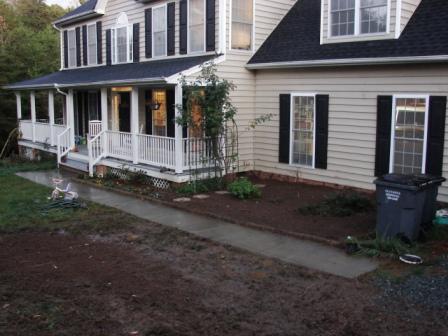 Well we finally got around to yanking everything out of the overgrown weedy front garden and filled it in with new dirt. It took quite a few hours and was mercifully accomplished in the rain so as to avoid heat stroke. We did manage to turn the front lawn into a mud slick with the bobcat, but since it was less “lawn” and more “dried up ugly brown patch” anyway, it’s ok. We reseeded and maybe we’ll actually get grass now.