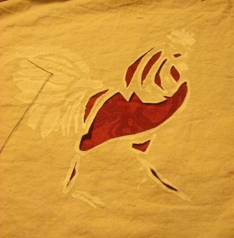 Aside from stuffing my face and packing unnecessary poundage onto my backside I have been making some little steps toward the holiday crafting that needs to be done. I have plans this weekend to make some ornaments with the girls and today I’ll be doing knitting and sewing all day (in my pj’s. I am not getting dressed until I have to go pick up the girls from the bus). I don’t want to give away too much just yet (there’s gifts involved afterall) but I want to show you a small bit of the tablecloth I’ve been working on. It’s a reverse – applique method with a rooster and rose stenciled motif. It’s actually almost complete so I will post a better picture then.