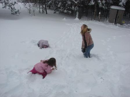 The girls had a blast playing and throwing snow at each other. I felt bad for them, though because we stopped buying them new snow gear a few years back since we never got any snow. Seemed like a waste. So today I had to scour the house for snowpants and jackets and boots (which we only had thanks to Veronica giving me her girls’ old boots – V you are such a life saver!). No one could find their gloves or mittens (they have them, they just like to lose them) so everyone went out with socks on their hands.