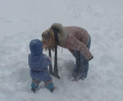 Oona wasn’t sure what to make of this crazy, cold white stuff that was taller than her.