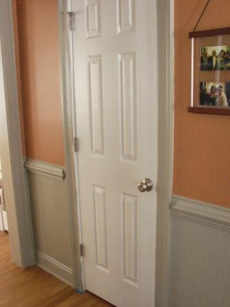 I decided I wanted a more colonial look – I just love those old houses with their milkpaint woodwork. I started papering the bottom half of the walls in the front room under the chair rail (it’s a wallpaper that’s made to mimic wainscoting) and then began the dreadfully laborious task of painting ALL the white trim downstairs. It’s going to take me forever and a day, but I’ve been working on it as I can and I am really liking the results.