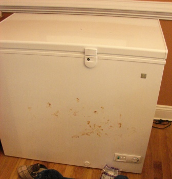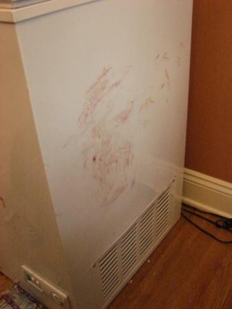 That’s the peanut butter and jelly from my sandwich. I refrained from feeding it all to the dog, as you requested, but I couldn’t help smearing it all over the freezer.