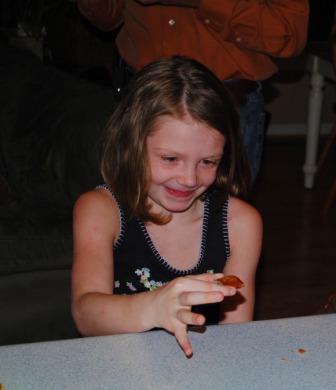 Emily declared herself unable to eat something that was rather alive at the time of purchase (she’s a vegetarian but will eat fish…..as long as it comes frozen in a box). Neve was fascinated by the shells and the whole process of cleaning them. As the adults started scarfing them down (with a dollop of dad’s fabulous cocktail sauce) we could all tell Neve was trying to summon up the courage to try one.