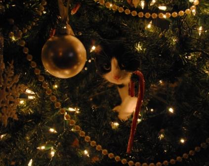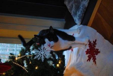 His favorite spot is about halfway up. You’ll know he’s there by the shaking and tinkling of ornaments.