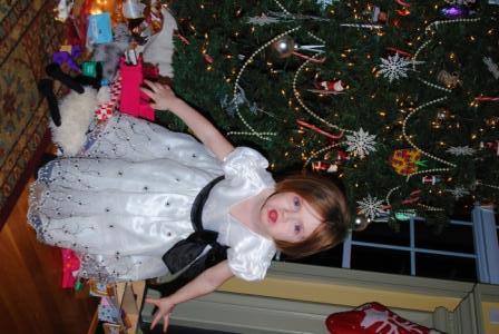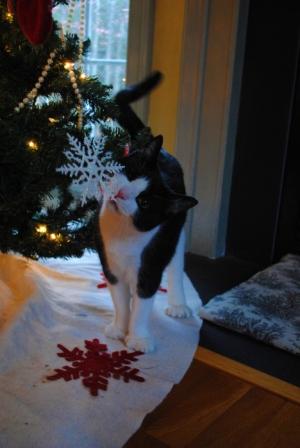 When not hanging out mid – tree threatening to topple the whole works, he likes to roll around underneath, chewing on the branches and messing up the skirt.