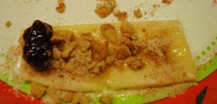 Brush each strip of dough with melted butter. Sprinkle with walnut – cinnamon mixture. At one end of each strip add a small dollop of preserves, then roll the strip up.