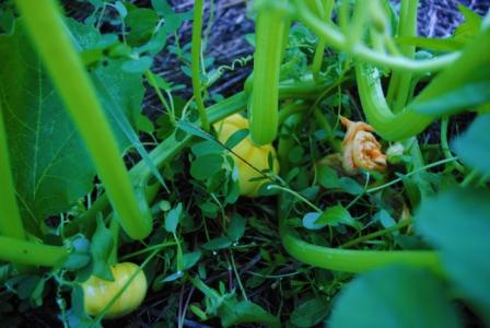 There’s some pie pumpkins beginning to orange (not enough, but hopefully we’ll get a few more before the vine stops producing), about 6 or so acorn squash getting darker by the day, and about a bajillion butternut squash – several of which look close to done.