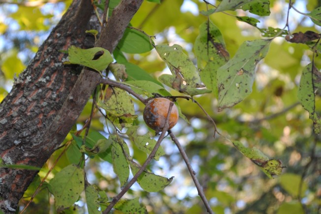 Most of the fruit is higher up in the tree (and I am not climbing it unless they really are persimmons, and therefor worth it) and as you can see from the leaves in the first photo, there is some sort of fungus or blight going on.