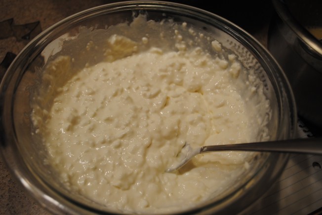 While that is resting, I made the blintz filling. I searched around the internet (well, Pinterest anyway) and got an idea for the general “feel” of a cheese filling. SO I mixed up a cup of small curd cottage cheese, a package of cream cheese, and a quarter cup of sugar.