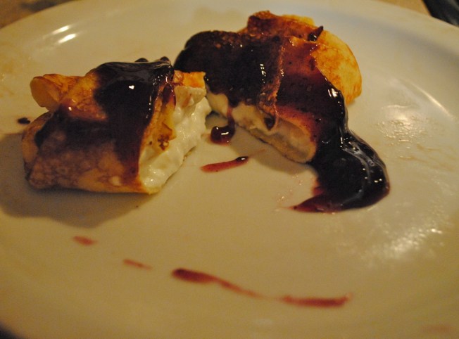 When all the batter was used up I rolled a good large spoonful of cheese filling into each crepe burrito – style and sauteed it about 2 or 3 minutes on each side until heated through and somewhat browned.