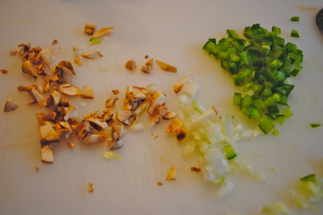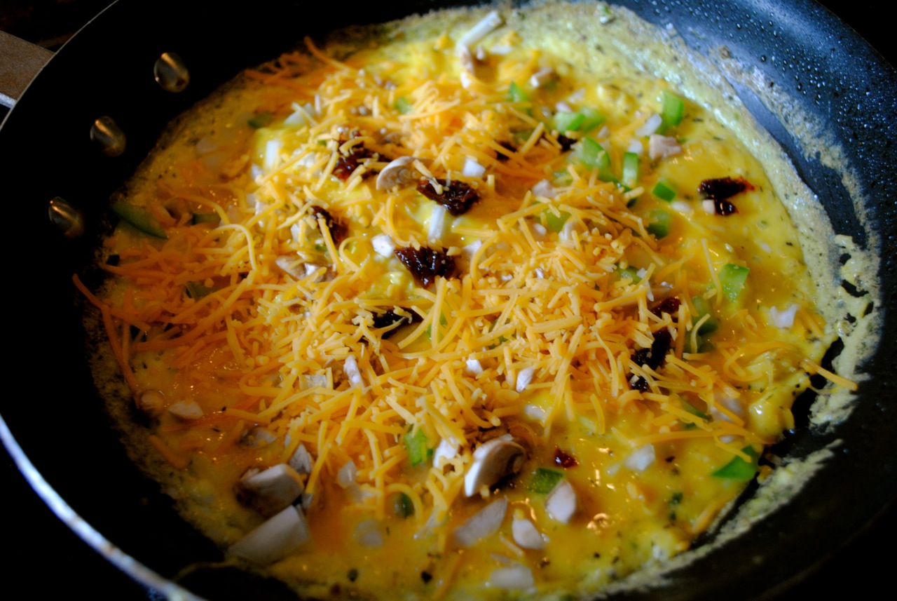 Cheese? Excellent. Make sure you have some grated or shredded cheese at the ready. I like to chop up mushrooms, tomatoes, green peppers and red onions as well. Sometimes I like to be different and do sun dried tomatoes with marinated artichokes and goat cheese. Be creative – meats are good, as are all kinds of cheeses and veg. Whatever you want, prepare it ahead of time so it’s ready to toss in. This Sunday I used shredded cheddar, green peppers, onions, sun – dried tomatoes and mushrooms.