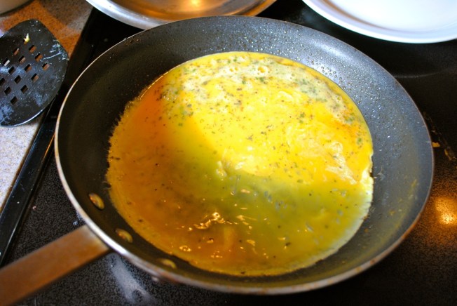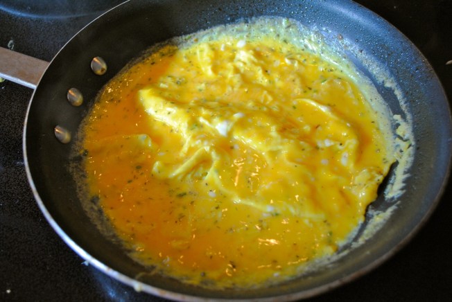 You want a medium-ish heat. Not too hot; you don’t want the eggs to sizzle when they hit the pan. You will need them to cook evenly and gently.