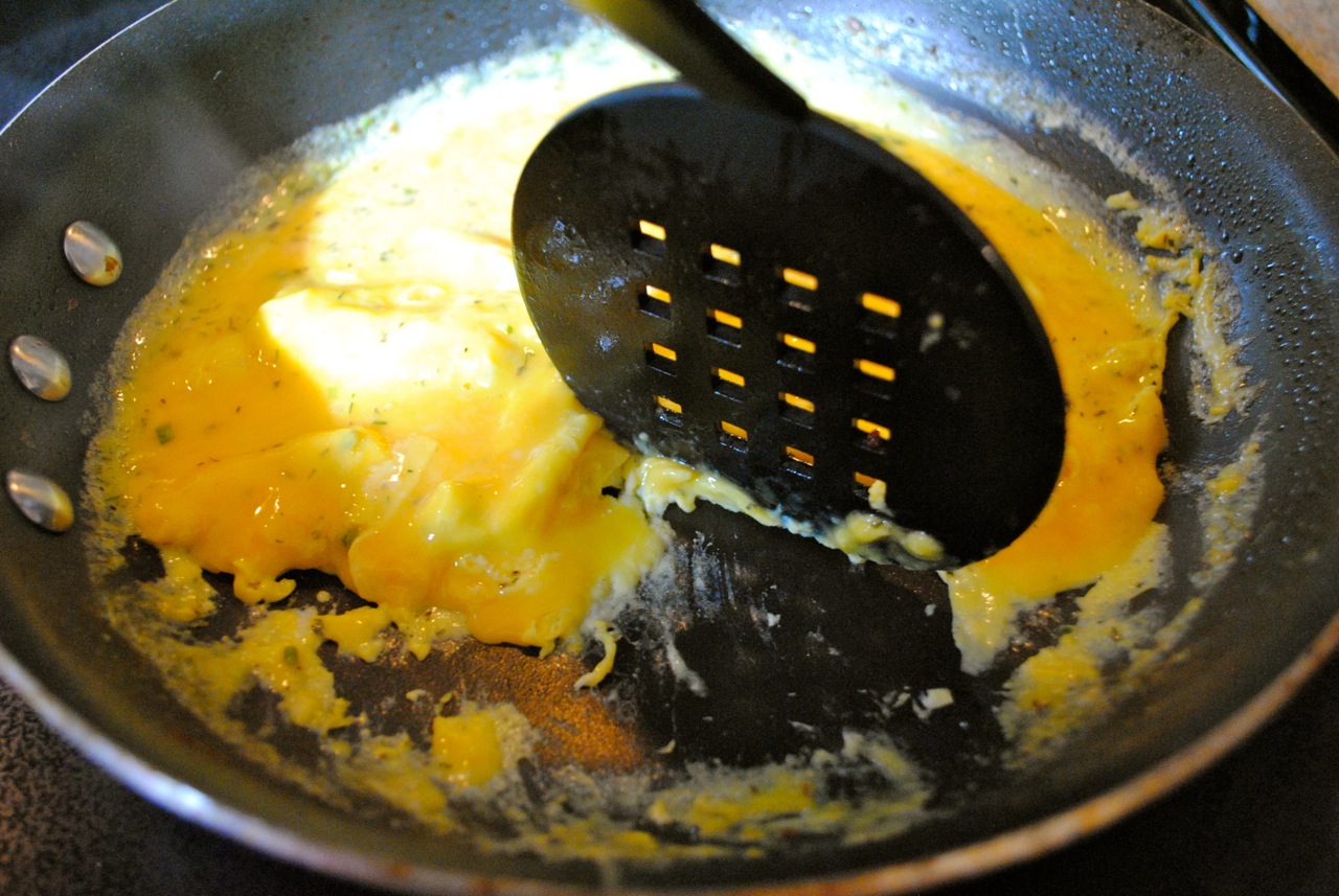 It’s not very tricky; you just want to maximize the amount of heat the runny parts get while minimizing the heat onto the cooked parts. This way none of it gets overcooked and hopefully nothing gets undercooked either (it helps to use fresh-that-day eggs if you are worried about undercooking!).