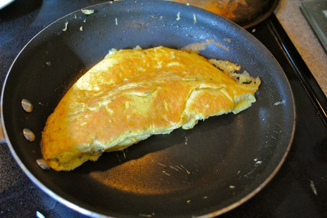 At this point, if I think the eggs look a bit too runny or if there is an awful lot of cheese to melt, I will put a lid on the pan and let it cook until almost completely firm.