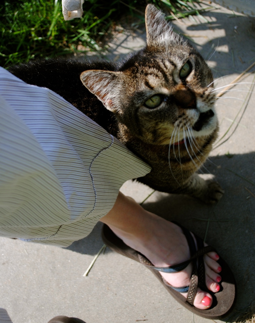We noticed this little tabby with a gravelly meow hanging out on our back deck for a few days in a row and figured she was too scared of the dog to go home, so we fed her.