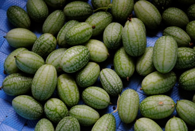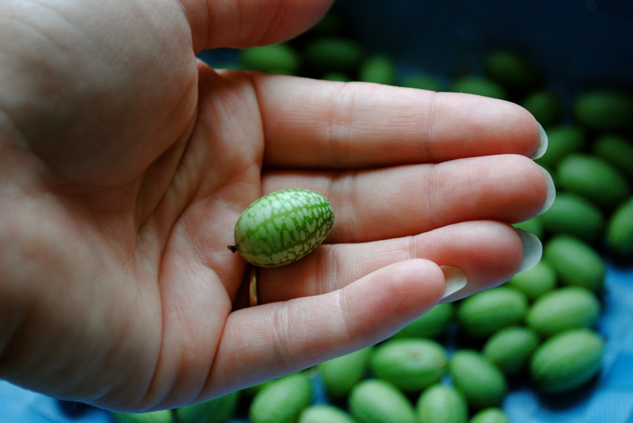 The good news is we’ve gotten quite a substantial crop of cucumbers despite the bugs. We’ve also had a bumper crop of surprising little things called “Mexican Sour Gherkins”. These are tiny sour – tasting cucumbers that look like mini watermelons.