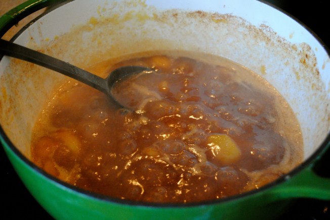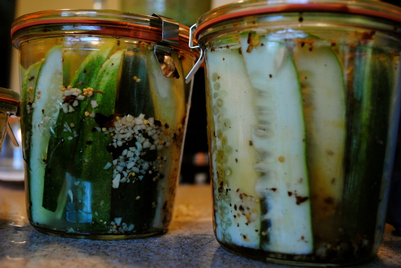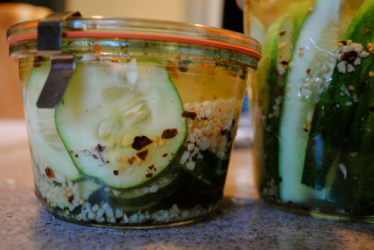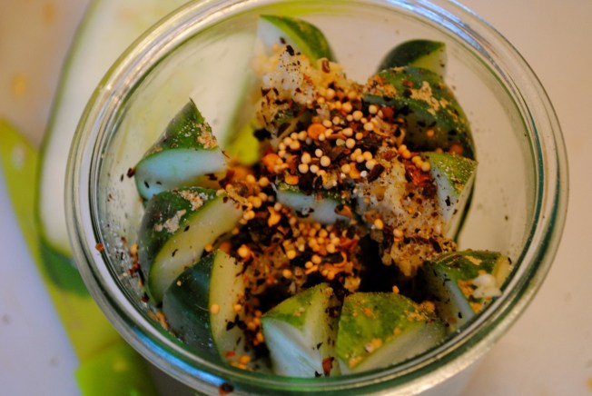I slice up my cukes however I want them (I like to do some jars bread and butter style, some spears, some halves). I stuff each jar with cukes, a spoonful of minced or crushed garlic, a dash of ground cinnamon (the recipe calls for one cinnamon stick per pint jar) , a teaspoon each of yellow mustard seeds and brown mustard seeds, a tablespoon or better of dill, a teaspoon or better of red pepper flakes (more if you like heat), a couple grinds of black pepper, and a few teaspoons of kosher salt. Exact science, right? You’ll get to know how to adjust these for taste after your first jar or two. Since you’re not canning it the recipe doesn’t have to be perfect. It is more important that you end up with the taste you want.