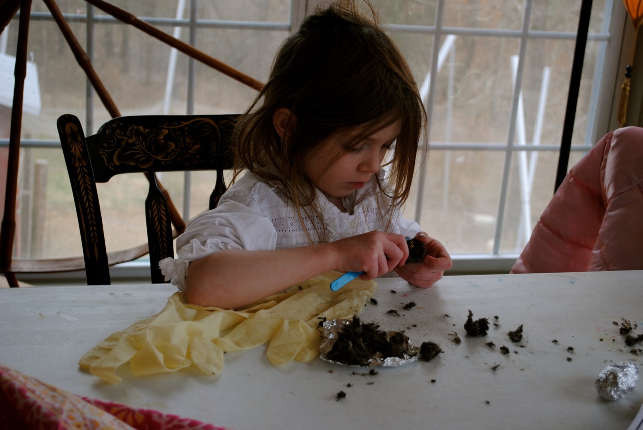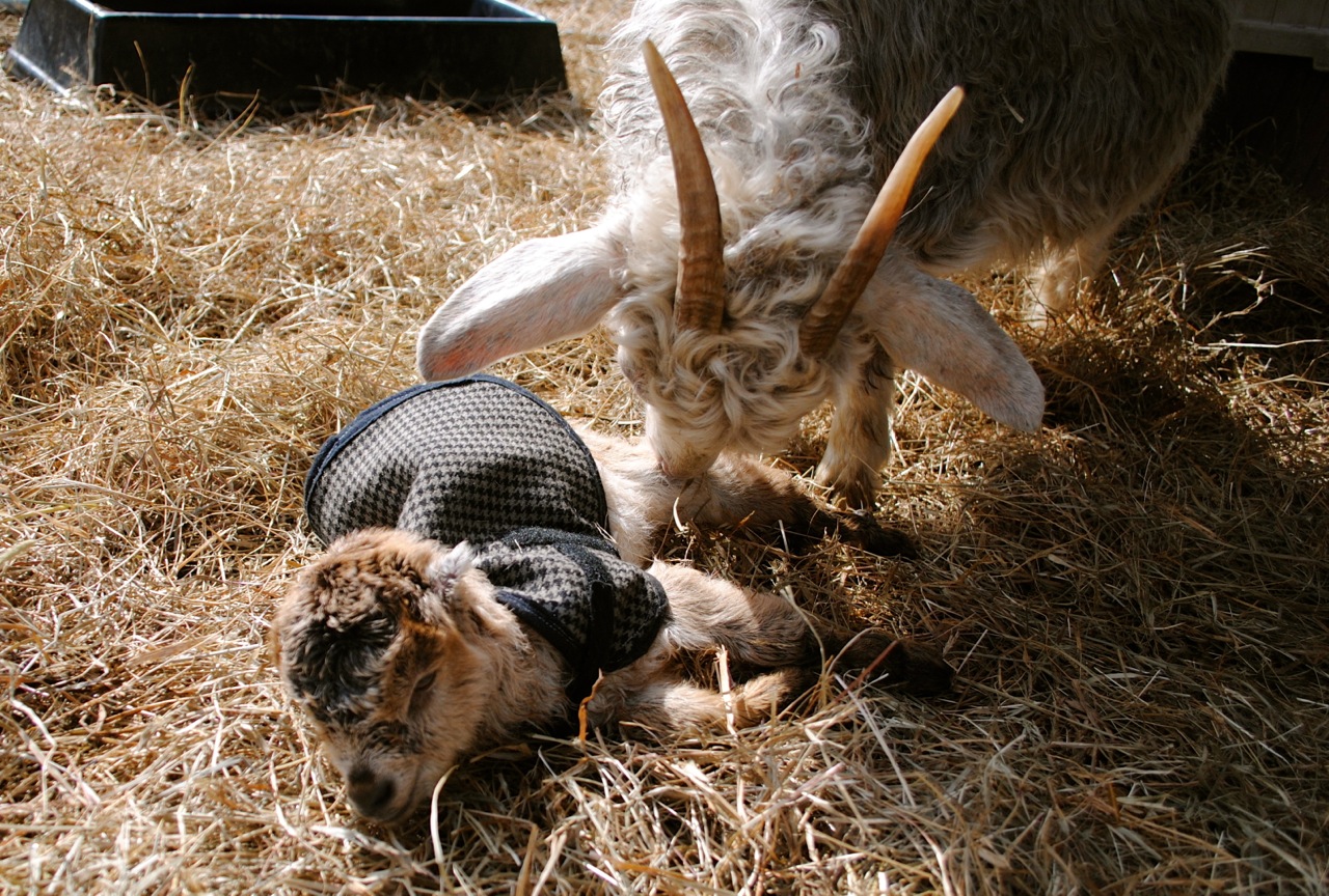Around lunchtime I peeked out and saw Adelaide on her side with her legs stuck out – not a normal position for a goat. I rushed down with some towels and my phone (Neve bringing up the rear) just in time to see her push out a tiny brown blob of adorable. I didn’t even have time to call for backup.
