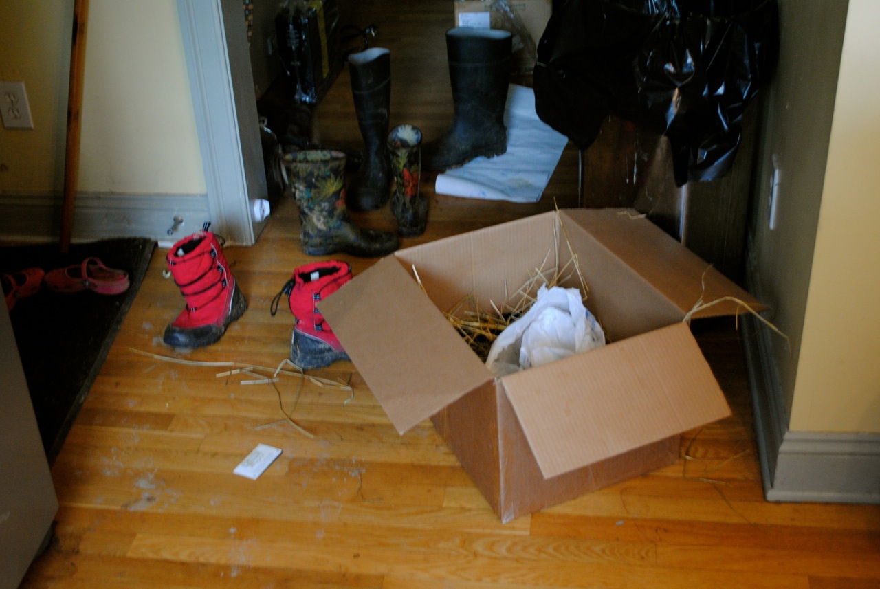 This is a stinky corner of my kitchen right now. That box is full of wet hay, lamb poo and paper towels used to clean up both. It was supposed to have gone out with the garbage the night before, but since I hadn’t expressly stated it the requisite one thousand times, it remains here. Also notice everyone’s muddy boots thrown everywhere and the paper towels thrown down on the dog pee in the pantry room behind it.