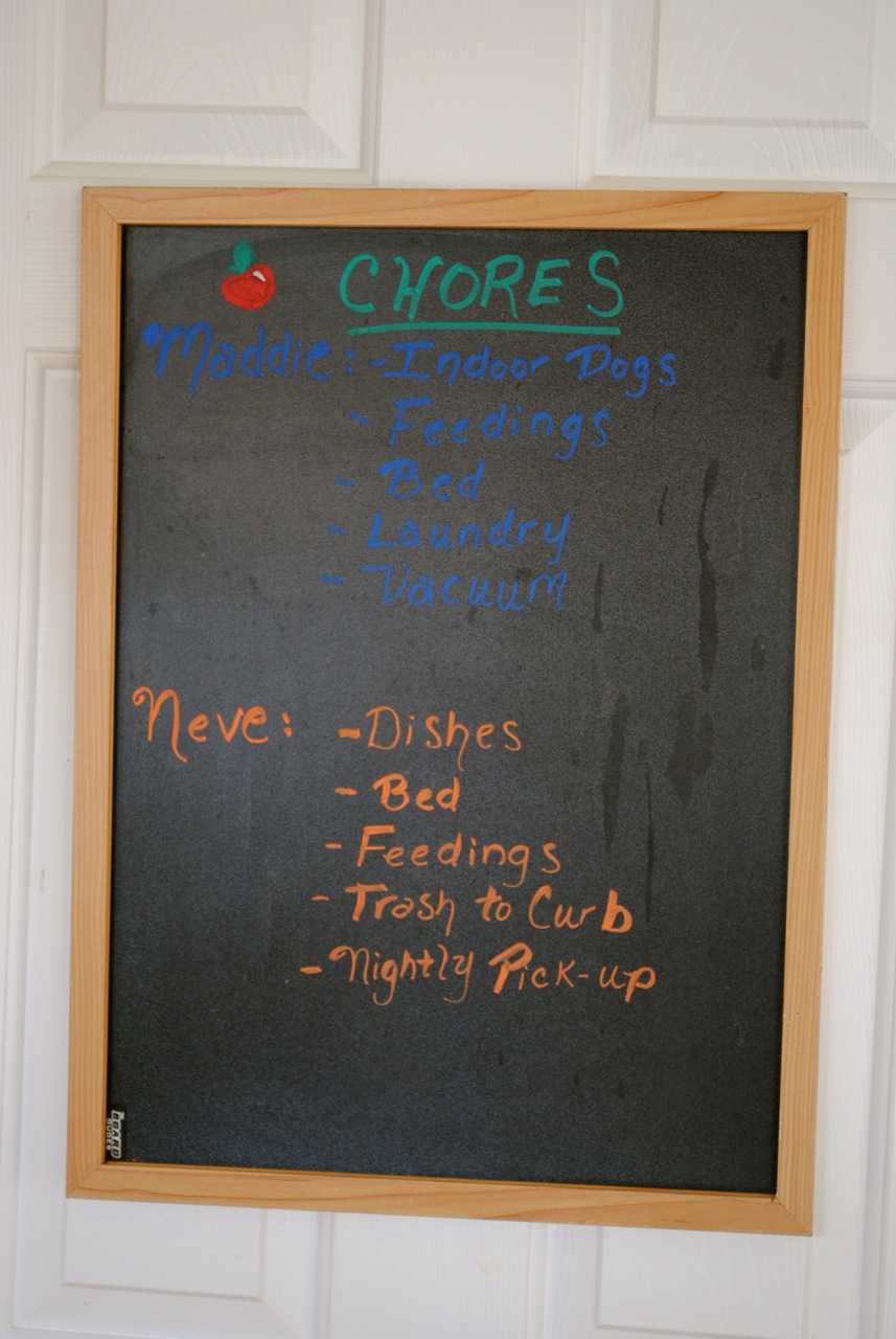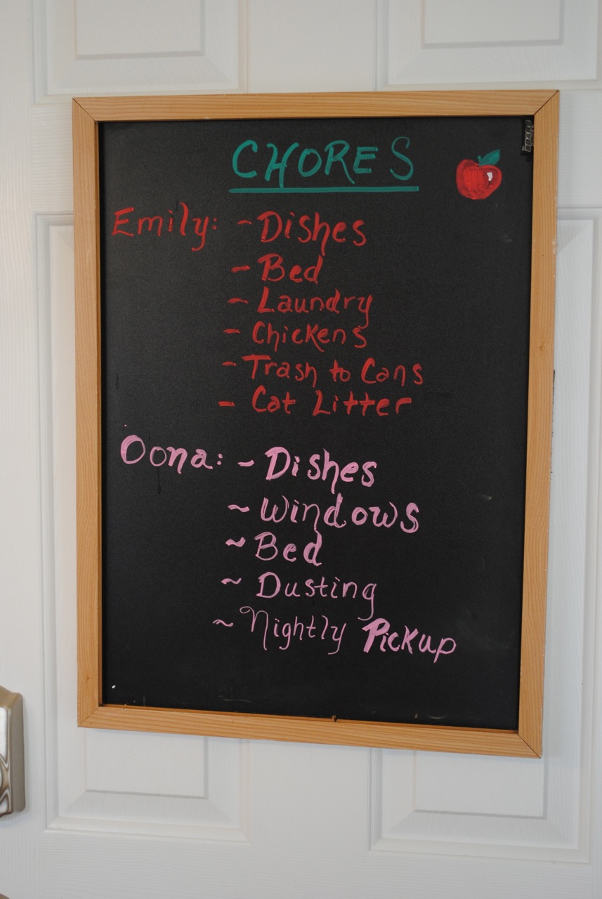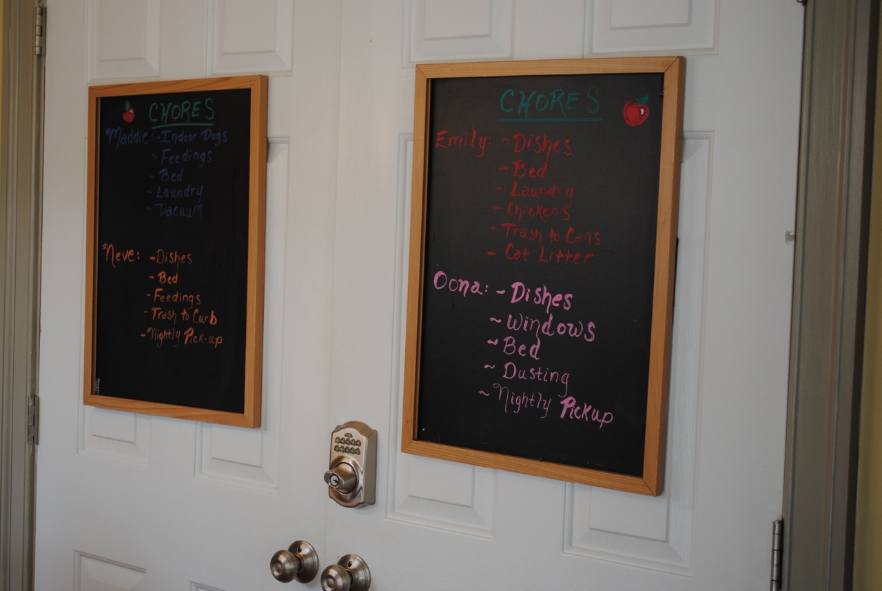 We’ve written everyone’s duties on chalkboards so there’s no more “confusion” as to who is doing what every day. The only thing that changes is who dies the dishes from day to day.