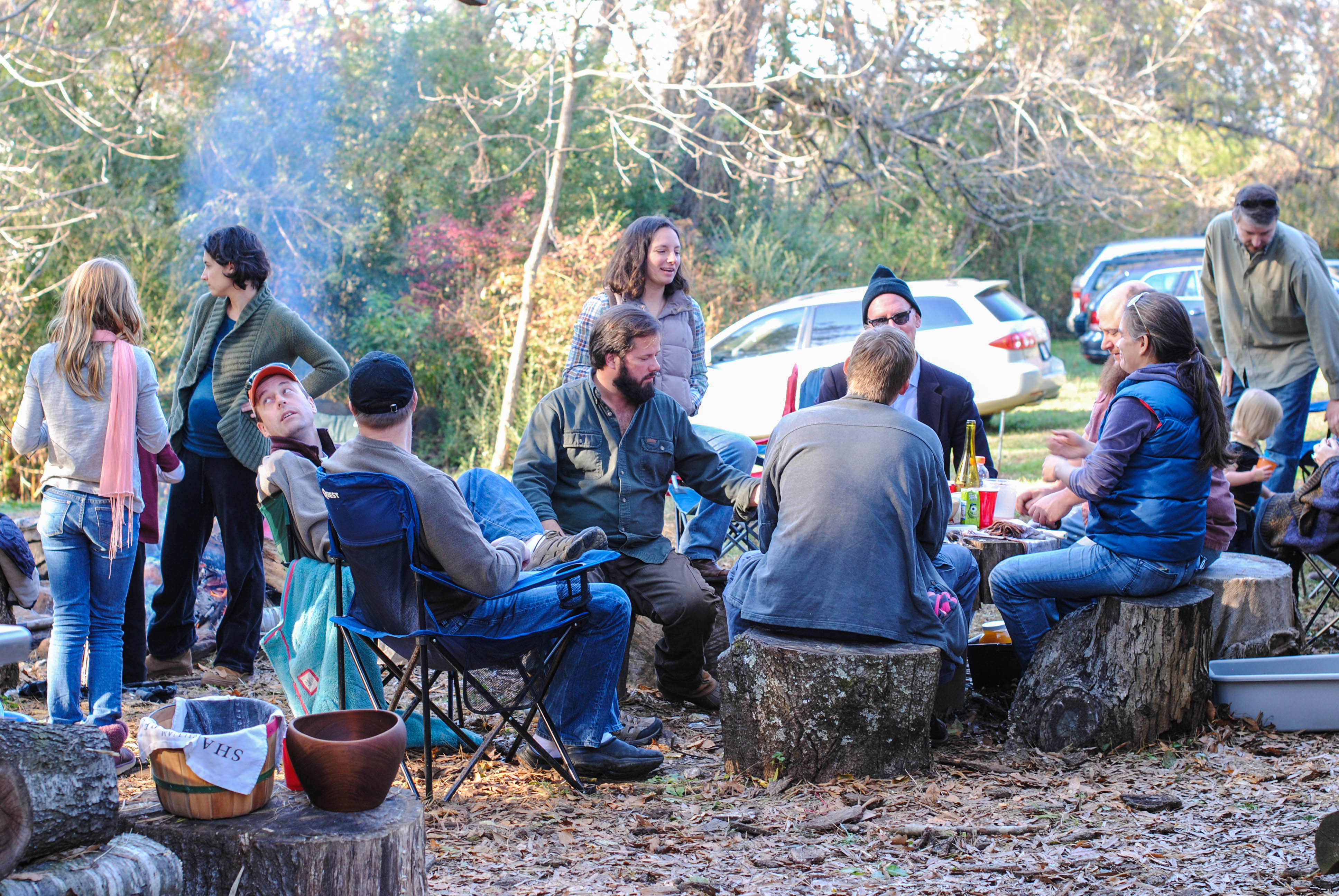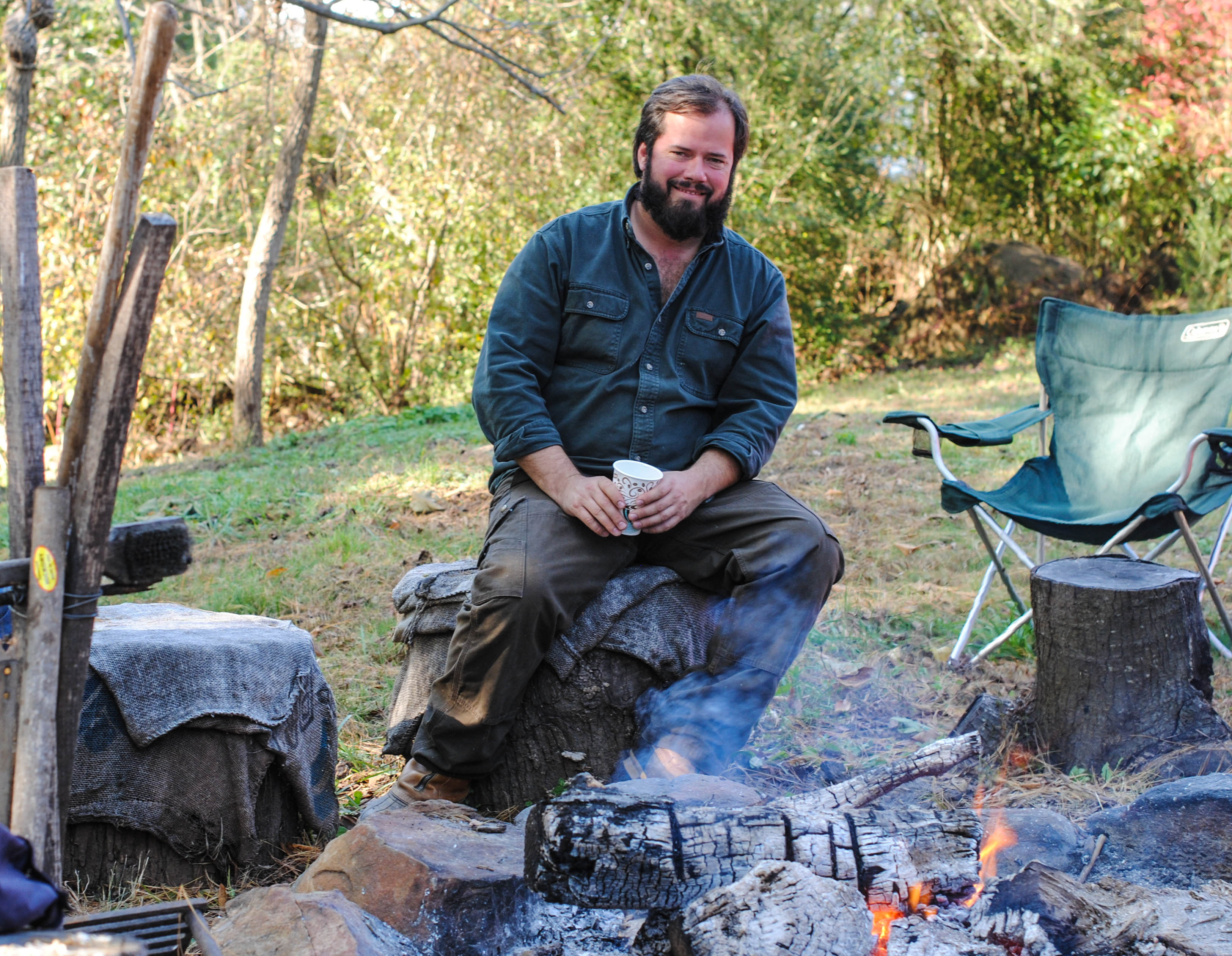 Tree stump chairs by the fire and food.