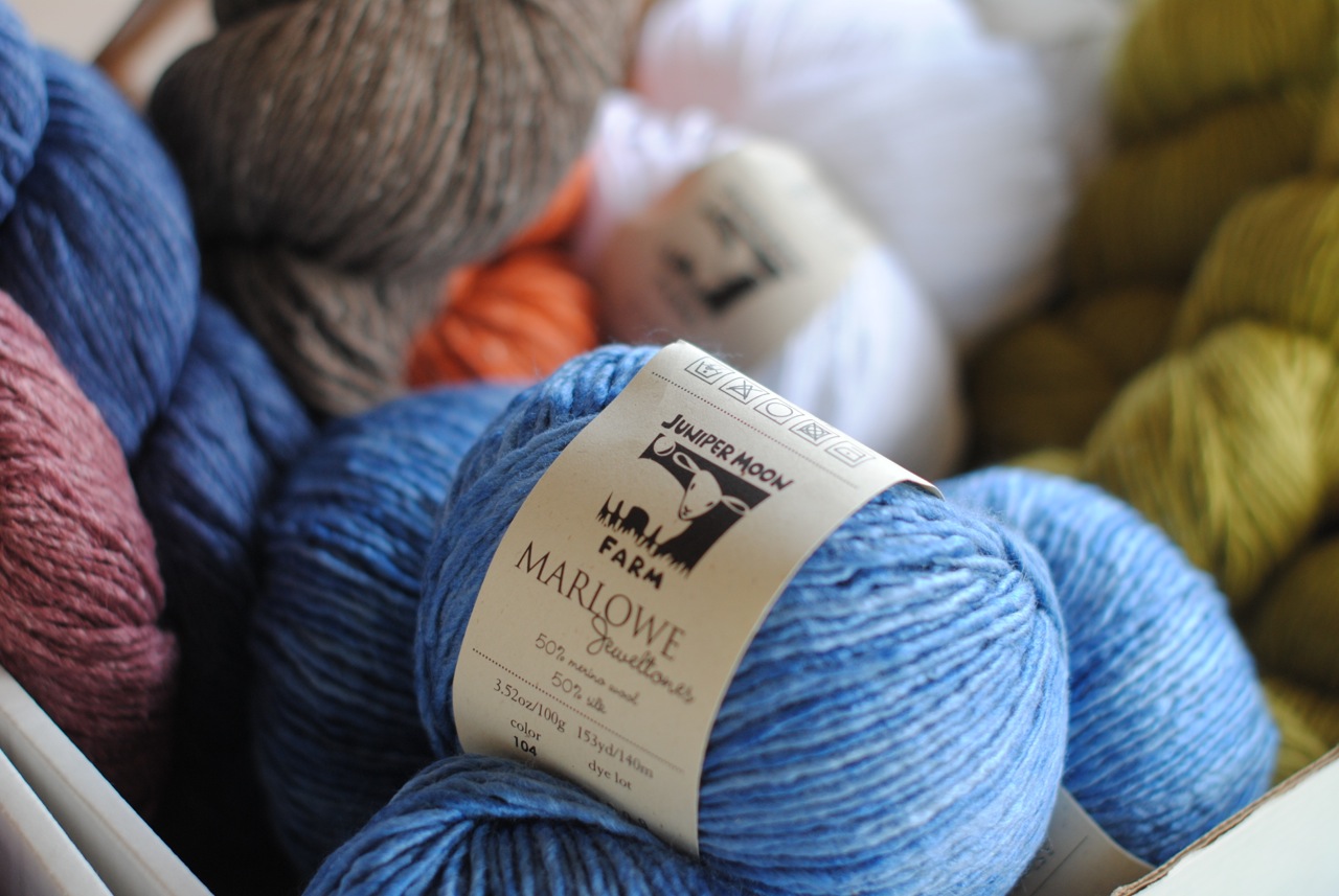 Susan sent samples of the newest Juniper Moon Farm yarn for everyone to try out. (My favorite is Marlowe!)