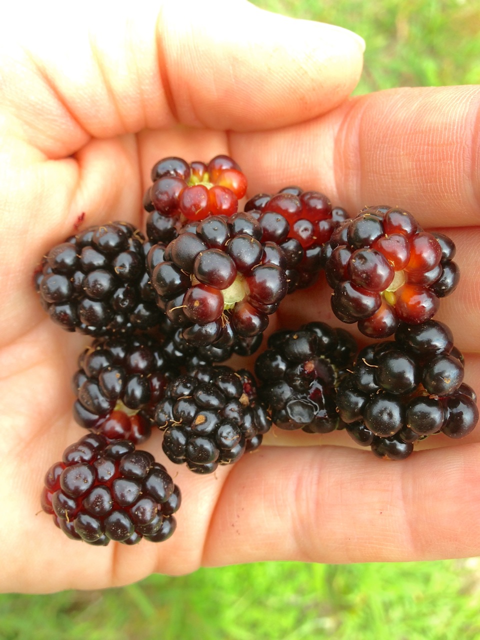 Most of the plants are just starting to grow back in from where the land was cleared a few years ago and aren’t in berry yet.  This means that in a year or two we will have more berries than we can handle.  I am so looking forward to making jam and vinegar with them!  For today we simple ate the berries out of hand.