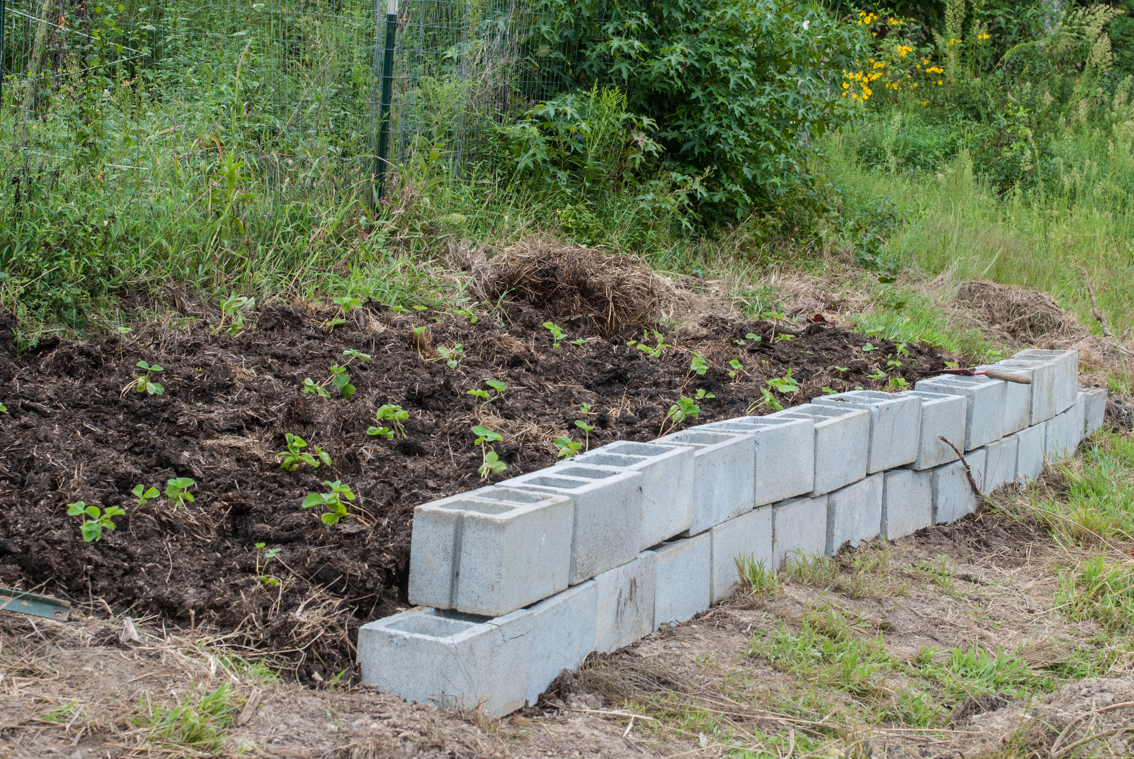 Luckily we had plenty of cinderblocks so I could put up a small retaining wall of sorts, and I dug up several bucket loads of composted manure and hay from the back field to fill in the with the dirt.