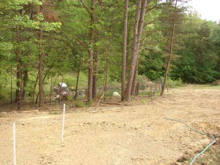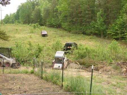 This is a rented bobcat. We’re clearing out the back acreage to make room for the pool, the animals, and a big garage. Our neighbor Jack is likewise extending out his yard, fence, and house. So they rented this big toy. It’s the kind they recommend for work in muddy, swampy conditions. Because it’s not supposed to get stuck.