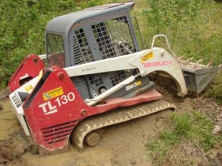 The winch wasn’t powerful enough. He didn’t want to back the truck too close to the mud, and he certainly wasn’t going to drive down the powerline path on the other side of the stream to pull the bobcat out that way. He wanted to try driving it out instead. I don’t know why he thought it would work. I think he managed to get it stuck even worse. $175 later we still had a stuck machine on our hands.