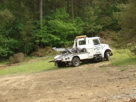 He tried digging it out with shovels. I felt pretty sure that if he kept up with that he would just make that thing sink deeper and deeper. The place where the machine got stuck is smack dab in the middle of the stream out back and the water was rising every time more mud was removed from the scene. Time to call in a tow truck.