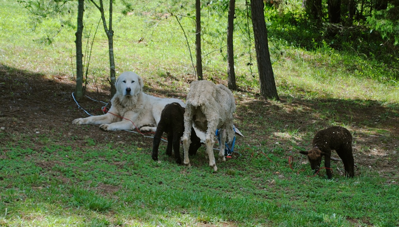 After I sent her back into the house (fighting and screaming the whole way), Emily and Neve and I managed to eventually get the dogs back through the gate. I identified numerous spots where Lucy had dug under the fence – and even one where she had bent it down by going OVER – and fixed them as best I could in the rain. I tied Lucy under a tree in the middle of the pasture as a temporary measure until I could work on getting the large kennel sections out to make a larger run to contain her but still give her plenty of room.