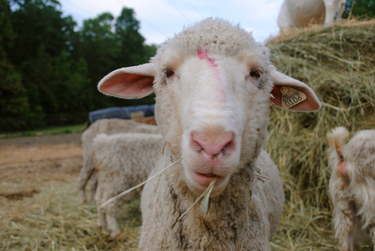 Darby was looking much perkier, and since the sun had come out I put him out in the grass by the house where he wouldn’t get trampled by the goats or dogs or other sheep. I then proceeded out back to get his mama, Amelia, so she could graze with him.