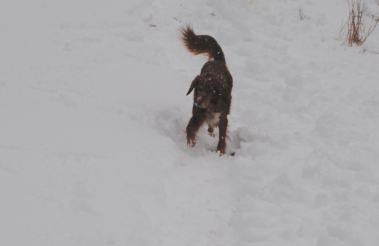 Keeping him in allows me to feed him extra treats throughout the day and know he’s snuggled up warm by the fire at night. He’s not too crazy about the arrangement. He still makes a mad dash for the door whenever it’s opened and will then take off after the first deer he sees. But happily, he has found a small friend in Piccadilly, who loves to rub her face on his snout and play with his giant paws.
